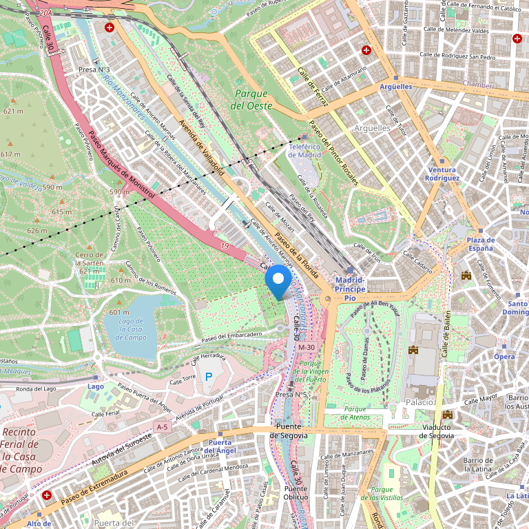 Станция метро: Atocha Renfe , линия 1. Изменить линию в "Трибунал" остановка метро на линии 10. Добраться до "Principe Pio" остановка метро.
