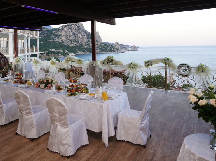 Отель Александрия располагает шикарным банкетным залом площадью 160 кв.м, выполненным в аристократических красно-коричневых тонах, а также открытыми террасами с панорамным видом на море. Шеф-повар отеля Александрия разработает специально для Вас праздничное меню, а команда отеля поможет организовать и провести свадебное т оржество.