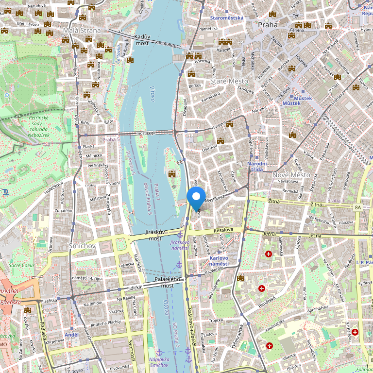 Отель Merlin расположен в центре Праги, на берегу реки, неподалеку от станции метро «Карлово поместье», в 14 минутах ходьбы от Карлова моста, Национального театра, Староместской площади, Вацлавской площади.