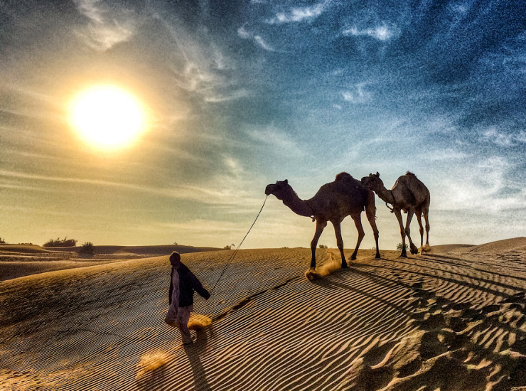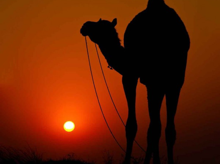 Закат или восход солнца с верблюдом в пустыне