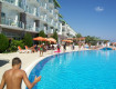 удобная территория, пляж на твердую тройку крупные булыжники в перемешку с песком, многие отбывают пальцы ног(в кемере лучше- мелкая галька) но пляж чистый, море чистое, удобно плавать. большой бассейн в центре. удобно расположенная сауна: из моря после душа прямо в сауну и в холодный бассейн. Класс.
