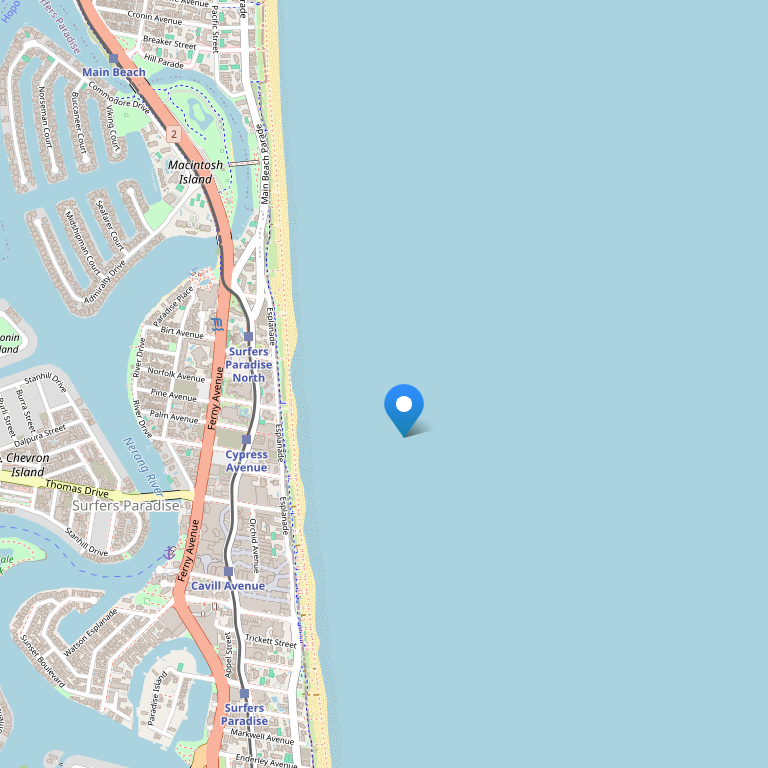 Отель расположен рядом с песчаным пляжем, в 10 минутах ходьбы (700 метров) от магазинов, ресторанов и баров на Кавилл-авеню и центра Серферс-Парадайз, в 25 км от внутреннего аэропорта Coolangatta Airport, в 85 км от международного аэропорта Брисбена и в 12 км от железнодорожной станции Nerang.
