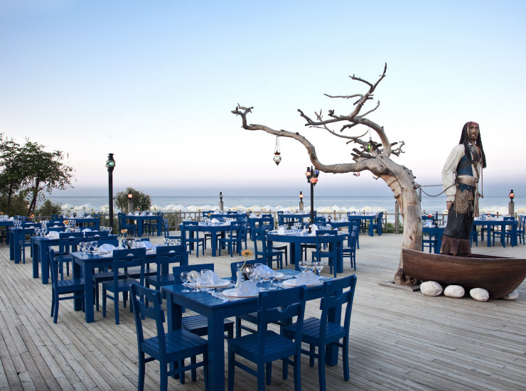 Главный ресторан с богатым выбором из меню турецкой и интернациональной кухонь (шведский стол); Snack ресторан и Aqua Snack ресторан; 12 ресторанов ala carte: средиземноморский*, итальянский*, французский*, русский*, индийский*, суши*, японский*, мексиканский*, рыбный, монгольский, барбекю, турецкий; 5 баров; турецкие лепешки и мороженое.