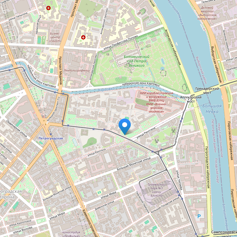 Отель расположен напротив Ботанического сада и в 5-7 минутах ходьбы до станции метро «Петроградская». До Петропавловской крепости и станции метро «Горьковская», пешая прогулка занимает 30 минут. До Невского проспекта - 1 станция метро. До Эрмитажа прогулка займет около 30-40 минут по прекрасной набережной вдоль Невы.