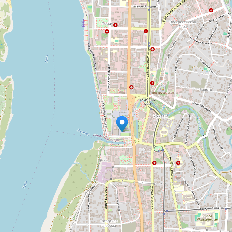 Несомненным преимуществом является ее идеальное местоположение: в деловом, культурном, историческом центре города и в то же время на берегу реки, в стороне от интенсивного транспортного потока. Окна гостиницы, выходящие на запад, открывают вид на реку Томь и бескрайние сибирские просторы. С верхних этажей другой стороны здания открывается великолепная панорама г.