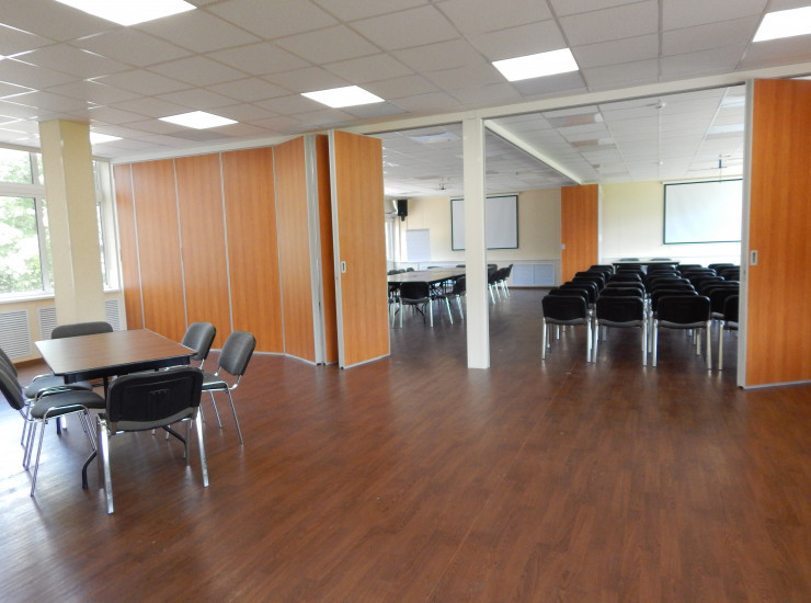 Конференц-зал, расположенный в жилом корпусе. Площадь 190 кв.м. Раздвижные перегородки делят зал на 3 части.Тип рассадки: театр, класс, круглый стол, U-форма.