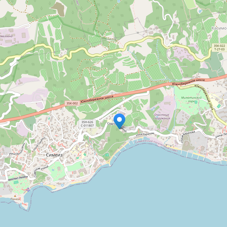 Собственный, крупногалечный, оборудован навесами и лежаками (за дополнительную плату). Расстояние до пляжа – 100 метров.