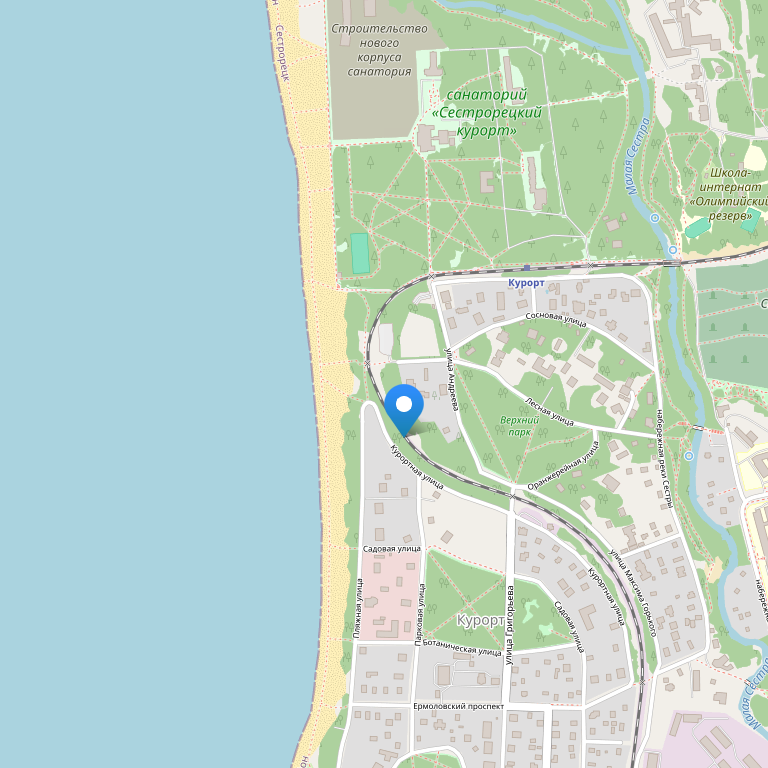 Отель расположен в популярном курортном районе Сестрорецк, в пригороде Санкт-Петербурга, и всего в нескольких метрах от Финского залива, в 40 минутах езды от Дворцовой площади и в 70 км к северу от аэропорта Пулково.