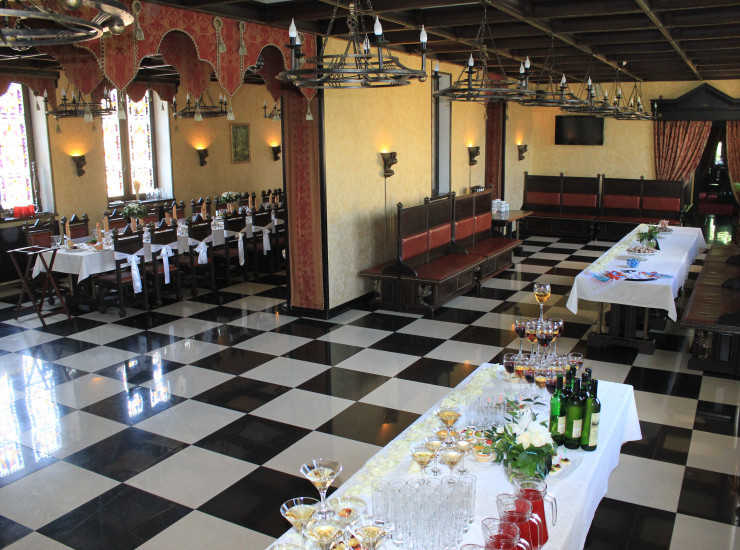 Неповторимый по своему стилю зал, разделенный на две части. Оригинальная сцена. Благородные тона мебели и гардин, замковый стиль, ощущение гармонии и уюта - воплощение вашей мечты! А отведав блюда нашей великолепной кухни, Вы почувствуете себя на настоящем графском приеме.