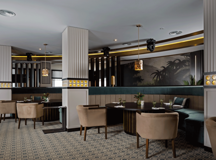 Ресторан разделен на несколько зон, чтобы гостям было удобно расположиться для отдыха. Зона у сцены самая просторная, здесь комфортно устроиться большой компанией, потанцевать.