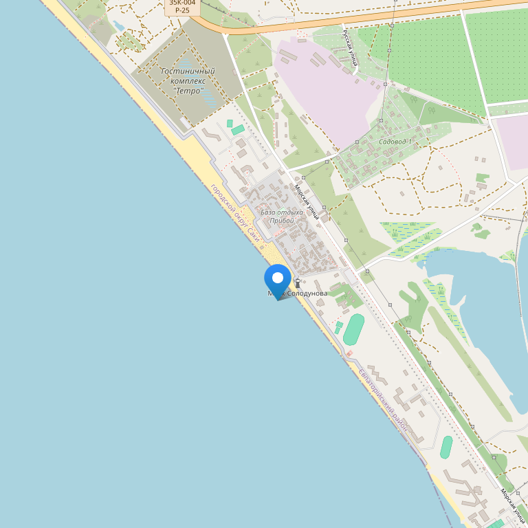 Общественным транспортом: от аэропорта г. Симферополь рейсовым автобусом "Симферополь - Евпатория" до г. Саки. От автовокзала и железнодорожного вокзала г. Саки маршрутным такси до ост. "База отдыха "Прибой".