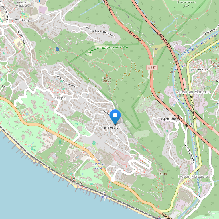 Отель расположен в городе Сочи, в 15 минутах ходьбы от Черного моря, в 5,5 км от Зимнего театра и в 4 км дендрария Сочи. Расстояние до железнодорожного вокзала Мацеста составляет 3 км, до международного аэропорта Сочи - 21 км.