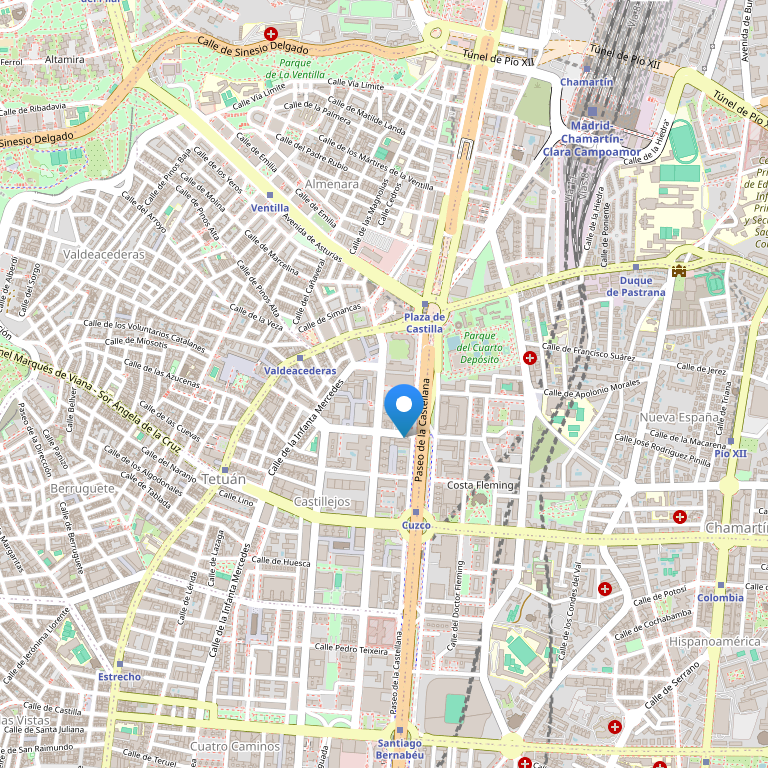 Отель Meliá Castilla расположен в современном финансовом центре Мадрида, параллельно главному бульвару города, Paseo de la Castellana, и в 15-ти минутах от аэропорта, что делает коммуникацию между ним и отелем идеальной. Также, рядом с отелем находится знаменитейший футбольный стадион Real Madrid Bernabeu и станция Chamartín.