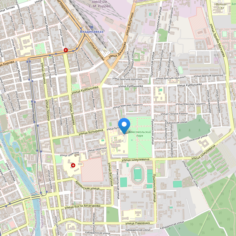 Расположена в центральной части города Владикавказ, в непосредственной близости от Государственного Университета им. К.Л. Хетагурова, Комсомольского парка, республиканского стадиона Спартак, кинотеатра Дружба, спортивного комплекса и плавательного бассейна Труд.