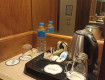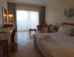 В номер приносят бутилированную воду неограниченно, халаты, тапочки, зубные щетки, чай, кофе, все это бесплатно и по просьбе. Кровать большая и удобная, есть терраса с видом на бассейн и море.в номере есть телевизор, фен, сейф. Уборка очень приличная.