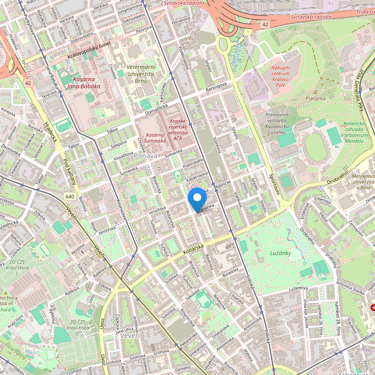 Отель расположен в Брно-Кралове Поле почти в центре города, приблизительно в 20 минутах ходьбы от так называемого «золотого креста» - площадь Свободы, улицы Ческа, Масарикова, Коближна и т.д. Добраться до отеля можно с железнодорожного вокзала на трамвае № 1 (по направлению в Ржечковице). Прямо перед отелем, на противоположной улице, находится один из самых больших и самых красивых парков Брно – парк Лужанки. В пределах пешей прогулки располагается вилла Тугендхат – известный памятник современной архитектуры, внесенный в список Всемирного наследия ЮНЕСКО. В 10 минутах ходьбы находится известный спортивный и развлекательный центр «Боби-центрум», рестораны и кафе, дискотека, боулинг, ролледром, крытый плавательный бассейн, а также больница и служба скорой помощи.