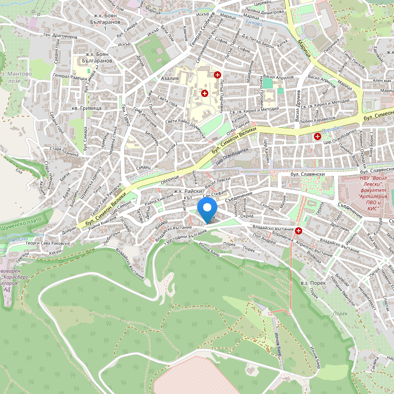 Отель находится в самом центре города Шумен, неподалеку от муниципалитета, центральной почты, окружного суда и нескольких банковских офисов. Идеальное сочетание комфорта и функциональности отеля делает его очень удобным местом для проживания во время деловых поездок, семейного отдыха и туризма. Среди местных достопримечательностей стоит ометить крепость Шумена в 3 км от отеля. Также стоит посетить руины древнего города Преслав в 20 км от отеля.