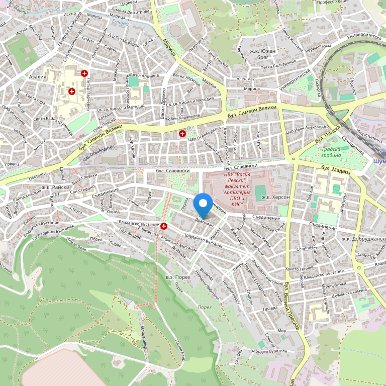 Отель расположен недалеко от главной торговой улицы города Шумен, недалеко от ключевых финансовых и административных учреждений. Также поблизости Вы сможете посетить культурно-исторические памятники, рестораны и развлекательные заведения.
