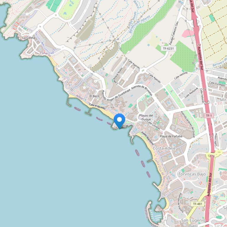 Муниципальный песчаный пляж отелей Playa La Caleta и Playa del Duque, зонтики, шезлонги, матрасы.