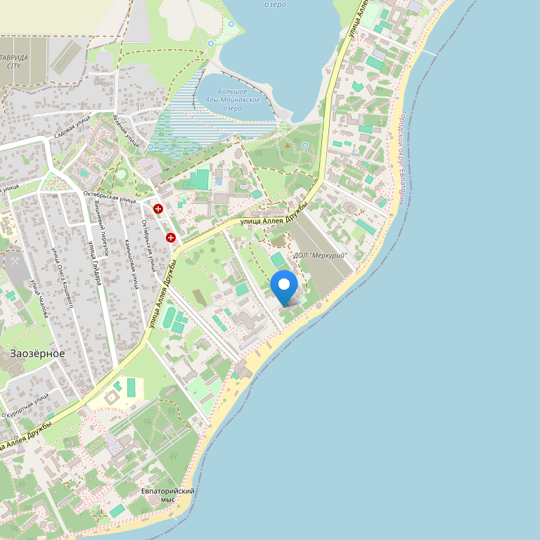 Отель расположен в поселке Заозерное, на расстоянии короткой пешей прогулки от пляжа, неподалеку от наиболее посещаемых туристами мест.