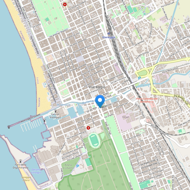 Отель расположен в нескольких метрах от пляжа, в центре Виареджо, недалеко от всех главных улиц города, где находятся многочисленные магазины, бары и рестораны. Напротив отеля находится открытый сад d'Azeglio, что отделяет его от причудливой набережной.