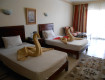 От аэропорта до отеля ехали примерно 1 час. Заселили сразу. Номер дали на первом этаже. Мебель в среднем состоянии. Нас было 3-е взрослых, но нам принесли какую-то кровать-раскладушку,которая сложилась пополам,когда на нее легли,хорошо,что хоть выпрыгнуть успела.Сходили на ресепшн, кровать заменили на нормальную.