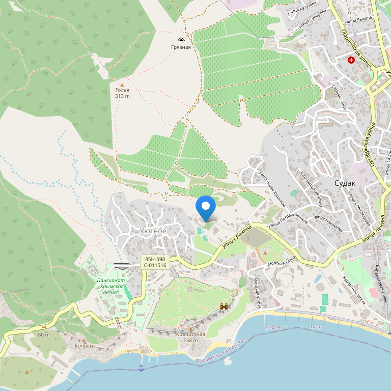 Отель расположен на берегу Черного моря в Крыму, в курортном городе Судак, рядом с Генуэзской крепостью, на расстоянии 15-ти минутной обзорной прогулки от побережья, в 3 км от автобусного вокзала Судака, а вот что бы добраться до села Дачное, необходимо совершить 10-ти минутную обзорную поездку по Крыму.