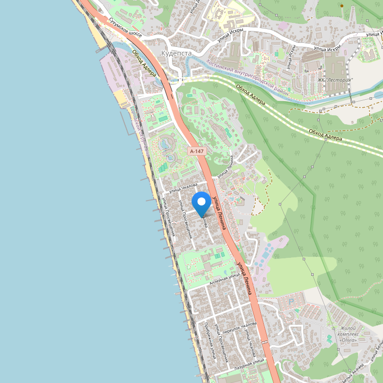 Отель расположен на Черноморском побережье, в курортном городе Адлер, на расстоянии 1,5 км от Сочинского океанариума, а вот что бы посетить торговый центр «Новый век», необходимо проехать 1,8 км на транспорте. Международный аэропорта Адлер–Сочи находится в 6 км от отеля.