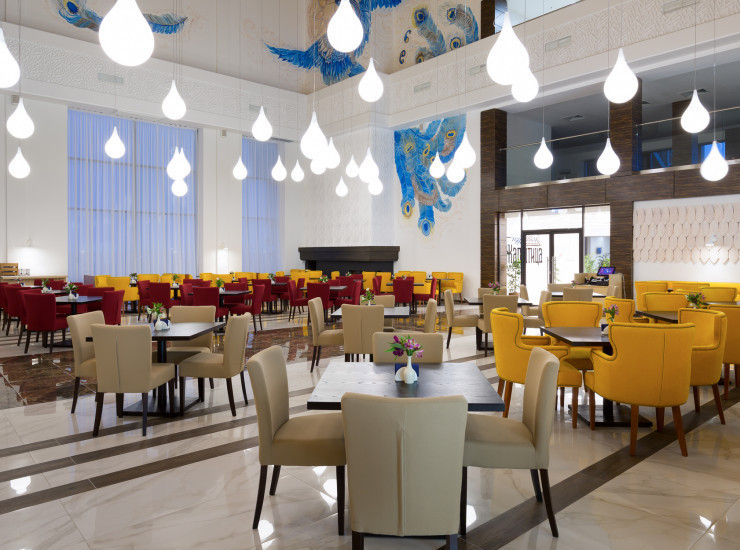 Атриум-ресторан "Жар-Птица" открыт для гостей на завтрак, обедах и ужинах, для всех Гостей курорта. Заказ столиков, проведение банкетов, обслуживание по a la carte.