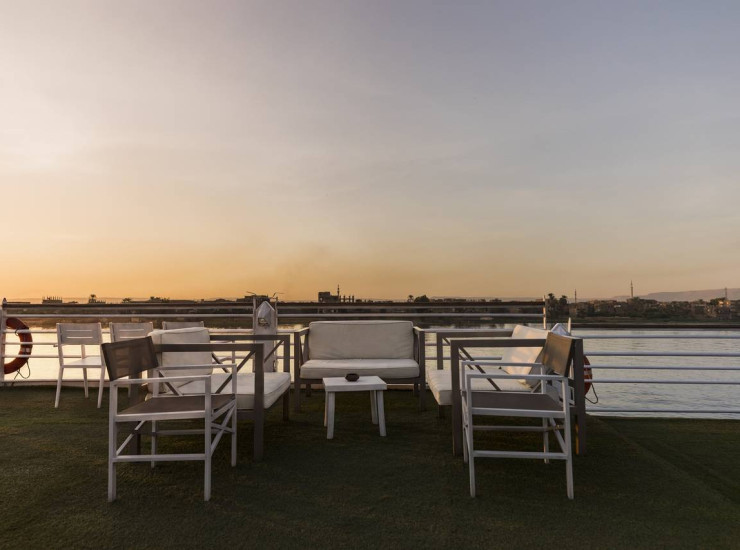 Наслаждайтесь прекрасным напитком на открытой веранде Semiramis I в изысканно оформленной атмосфере с видом на потрясающие пейзажи Нила.