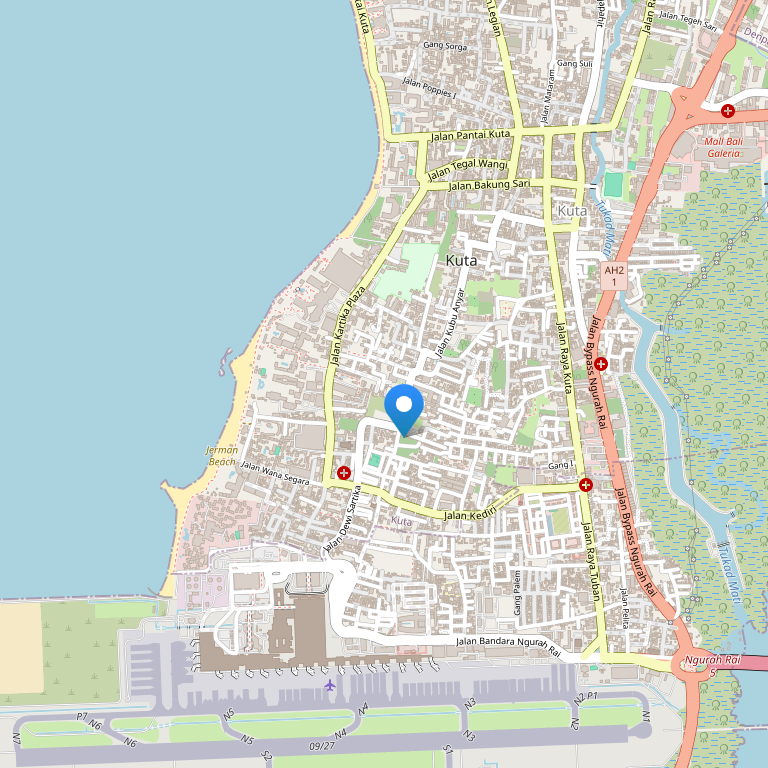 Отель расположен в курортном городе Кута, на юго-западном побережье Бали, в 5 минутах езды от международного аэропорта и недалеко от пляжа.