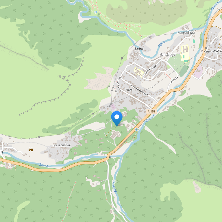 Отель расположен в Баксанской долине, на территории живописного национального парка Приэльбрусье, на высоте 1800 м над уровнем моря; в 12 километрах от горы Эльбрус и 9 км от горы Чегет. Расстояние до города Нальчика составляет 130 км (путь от аэропорта до отеля занимает 1,5 часа) и 200 км до города Минводы (путь от аэропорта до отеля занимает 2,5 часа).