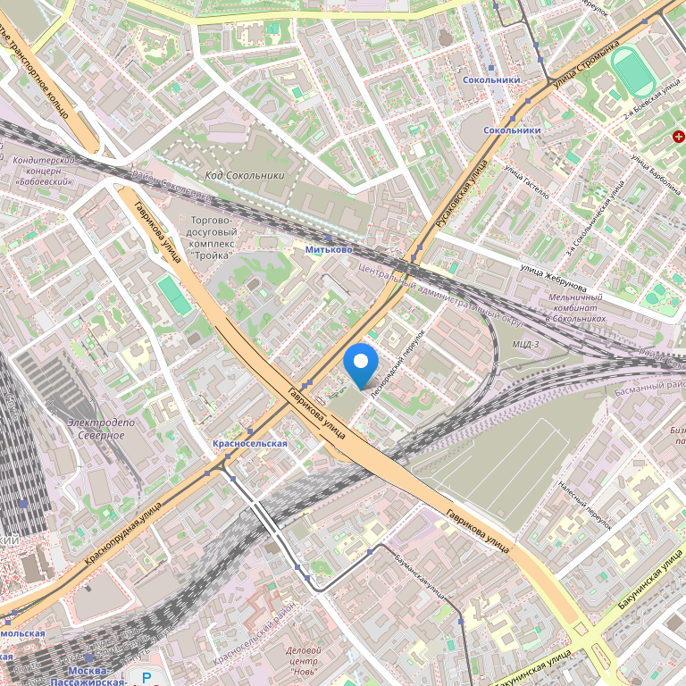 В центральном округе Москвы, рядом со станциями метро Красносельская и Сокольники. Также очень удобно добираться от площади трех вокзалов (Ярославский, Казанский, Ленинградский вокзал) - 11 минут на общественной транспорте , либо 20 минут пешком.