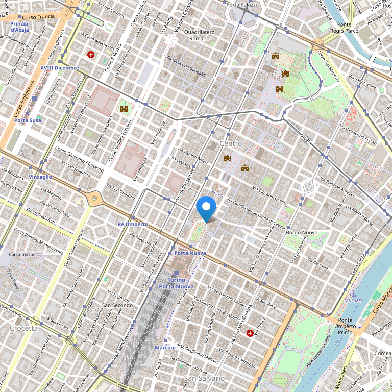 Находится непосредственно в центре Турина, в 50 м от Центрального железнодорожного вокзала, в 4 км от здания Конгресса Линготто, в 18 км от международного аэропорта города.