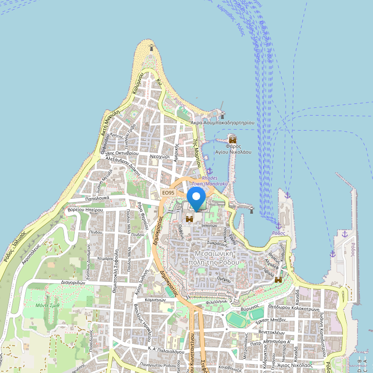 Отель расположен в городе Родос, на площади "Ekato Hourmadion".