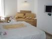 Заселили в клубный номер на первом этаже в двухэтажном отдельном корпусе. Это для нас (я, жена и доченька 3-х лет) оказалось очень удобно. Номер уютный с санузлом, кондиционером двуспальной кроватью, диваном, балконом.