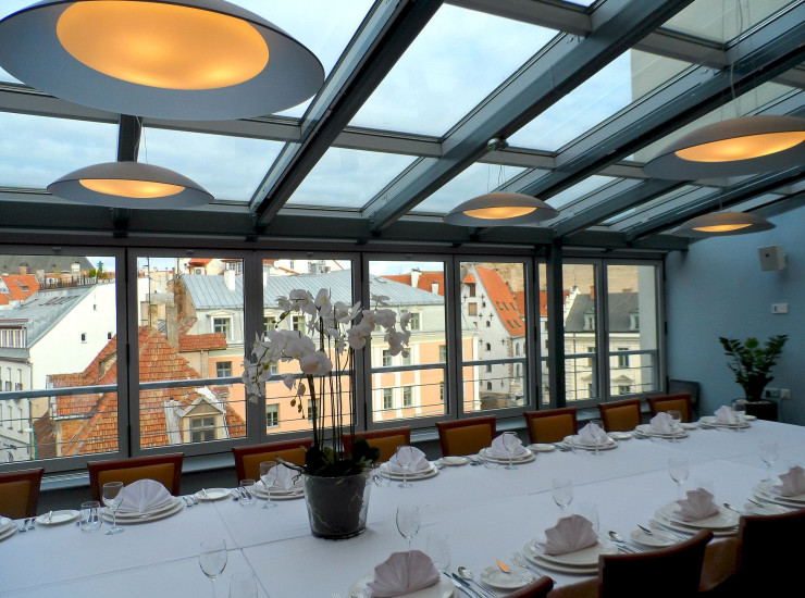 Банкетный зал на 6-ом этаже с великолепным видом на крыши и башни церквей Старой Риги. Отличное место для званного ужина, банкета, семинаров, деловых встреч.