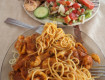 несколько видов ,салаты,гарниры,фрукты,пирожное.Обслуживание персонала отличное.Работа аниматоров просто супер.Скучать не дадут не кому.