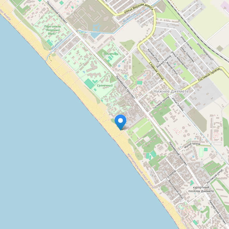 База отдыха "Динамо" расположена в городе Анапа на первой береговой линии в районе поселка Джемете, на широкой песчаной косе у кромки моря.