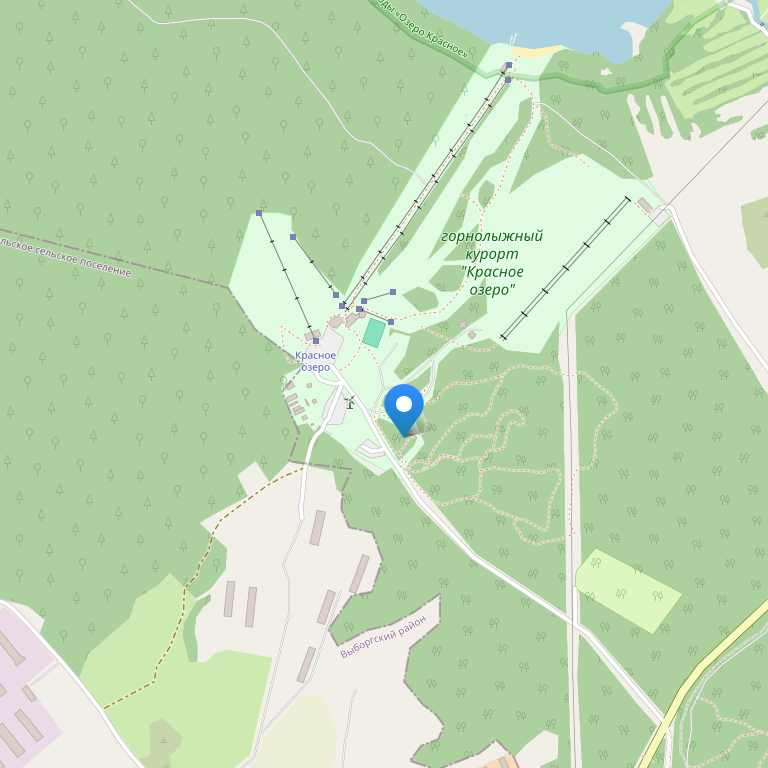 На озере Красном имеется комфортабельный пляж с вышкой для прыжков, оборудованный всем необходимым для полноценного водного отдыха, к которому вас доставят на подъемнике.