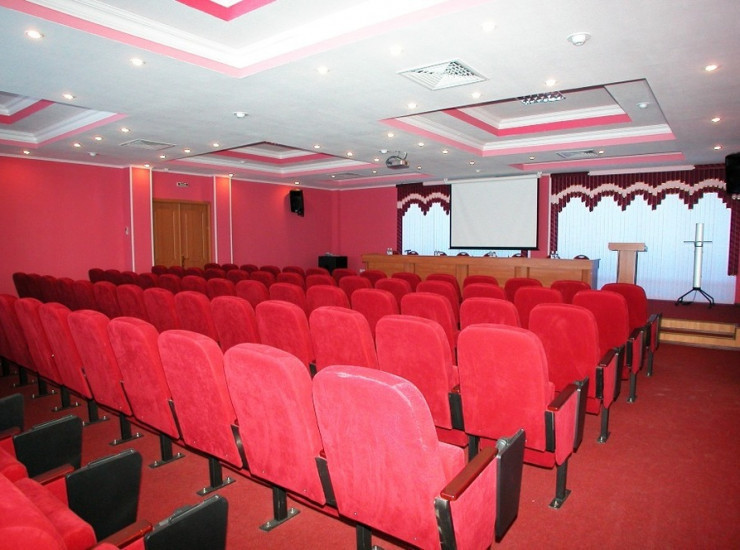 Рассадка: до 120 мест(театром), 8 мест в президиуме. Комната переговоров 10 мест.