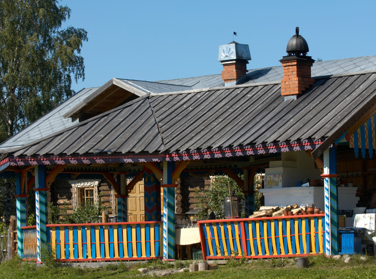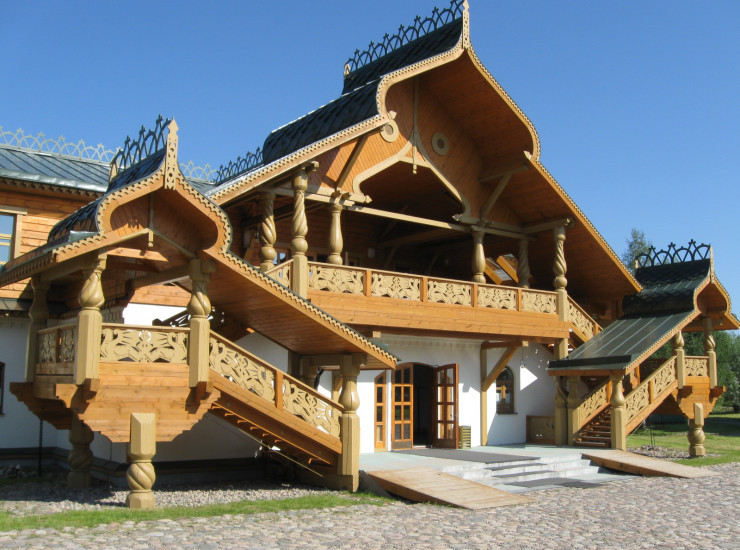 Дом 2 Дом резчика. Он полностью оформлен народным художником Карелии Ю. Гусевым, не пожалевшим на эту работу несколько лет жизни. Ощутить себя обитателем старинной избы помогает множество подлинных исторических предметов обихода и неповторимая резьба. В доме имеется обеденный зал и кухня, две спальни, гостиная, один санузел с душевой кабиной, балкон. В гостиной люстра в виде птицы-счастья освещает старинный ткацкий станок и коллекцию самоваров и утюгов.