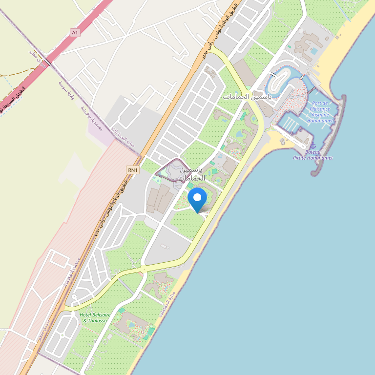 Отель расположен между Мединой Хаммамета и пляжем Ясмин Хаммает - в 200 метрах от Медины и в 64 км. от международного аэропорта Tunis-Carthage (50 минут езды).