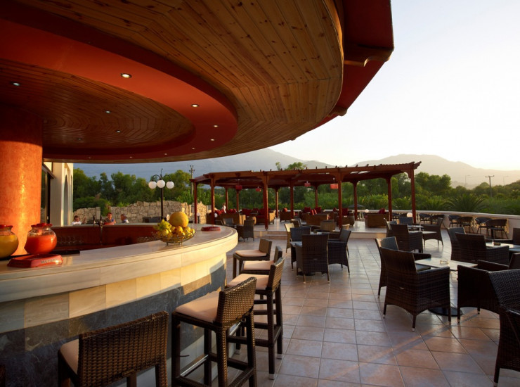 The Central Bar &#34;Dionysos&#34;, in modern and classic furnishing and his veranda has view the swimming-pool, the river or the sea. In the exterior space of the bar you will find also a suitably shaped theatre ideal for many events of hotel. A large variety of Greek and other drinks can be found in the Main Bar which is open every evening up to late the night.