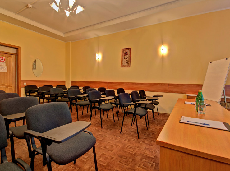Просторный зал заседаний рассчитан на 50 человек, площадью 42 кв.м. и расположен на 1 этаже гостиницы. Предусмотрена свободная расстановка мест. Для удобства участников мероприятий каждое кресло оборудовано пюпитром (откидным столиком). Необходимое оборудование предоставляется бесплатно - проектор LCD Epson, экран 2*2, аудио- и видеоаппаратура, флип-чарт, есть Wi-Fi. Возможно использование собственной аппаратуры.