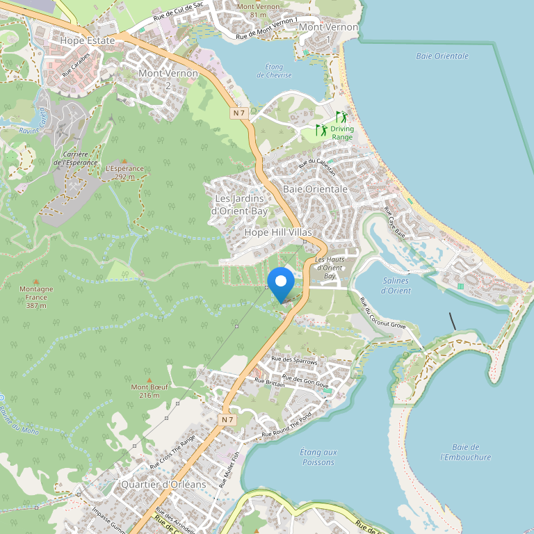 Отель расположен на склоне холма над пляжем на французской стороне Сен-Мартен, в окружении пышных тропических садов.