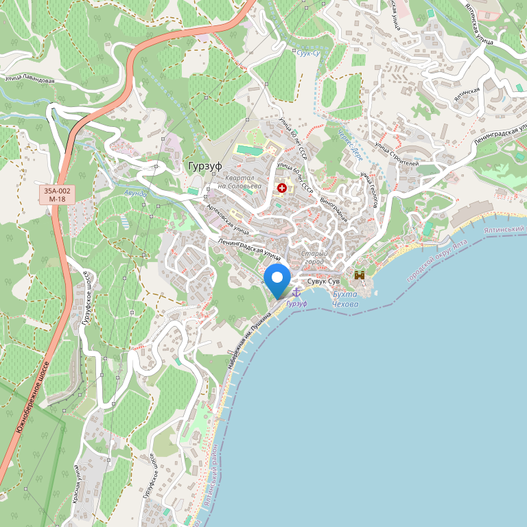 Пансионат расположен на берегу одной из самых живописных бухт Черного моря, на набережной Гурзуфа, в 50 метрах от пляжа.
