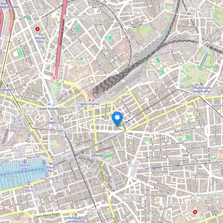 Отель расположен в центре Марселя, напротив центрального железнодорожного вокзала Марселя Saint Charles (1 минута ходьбы), в 200 метрах от станции метро Saint Charles, в 20 км от аэропорта Marseille Provence, в 1 км от порта Vieux Port, в 5 км от Les Calanques.