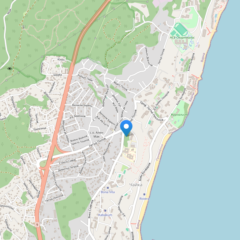 Комплекс расположен в 300 метрах от берега моря, в 2 км от болгарского курорта «Золотые пески», в тихом месте на высоком берегу. Комплекс находится в: 100 м от боулинга; 100 м от супермаркета; 300 м от пляжа; 300 м от автобусной остановки; 1 км от яхтенной пристани – порт Палас; 1 км от термального источника – пляж Кабакум; 3 км от Аквапарка Золотых песков; 10 км от города Варны; 20 км от аэропорта Варны.