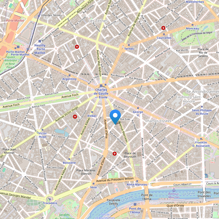 Отель расположен между Триумфальной Аркой и Трокадеро. Рядом с отелем Елисейские Поля и Эйфелева башня. В 30-45 минутах от международного аэропорта Руасси Шарля де Голля и 30 минутах от международного аэропорта Орли.